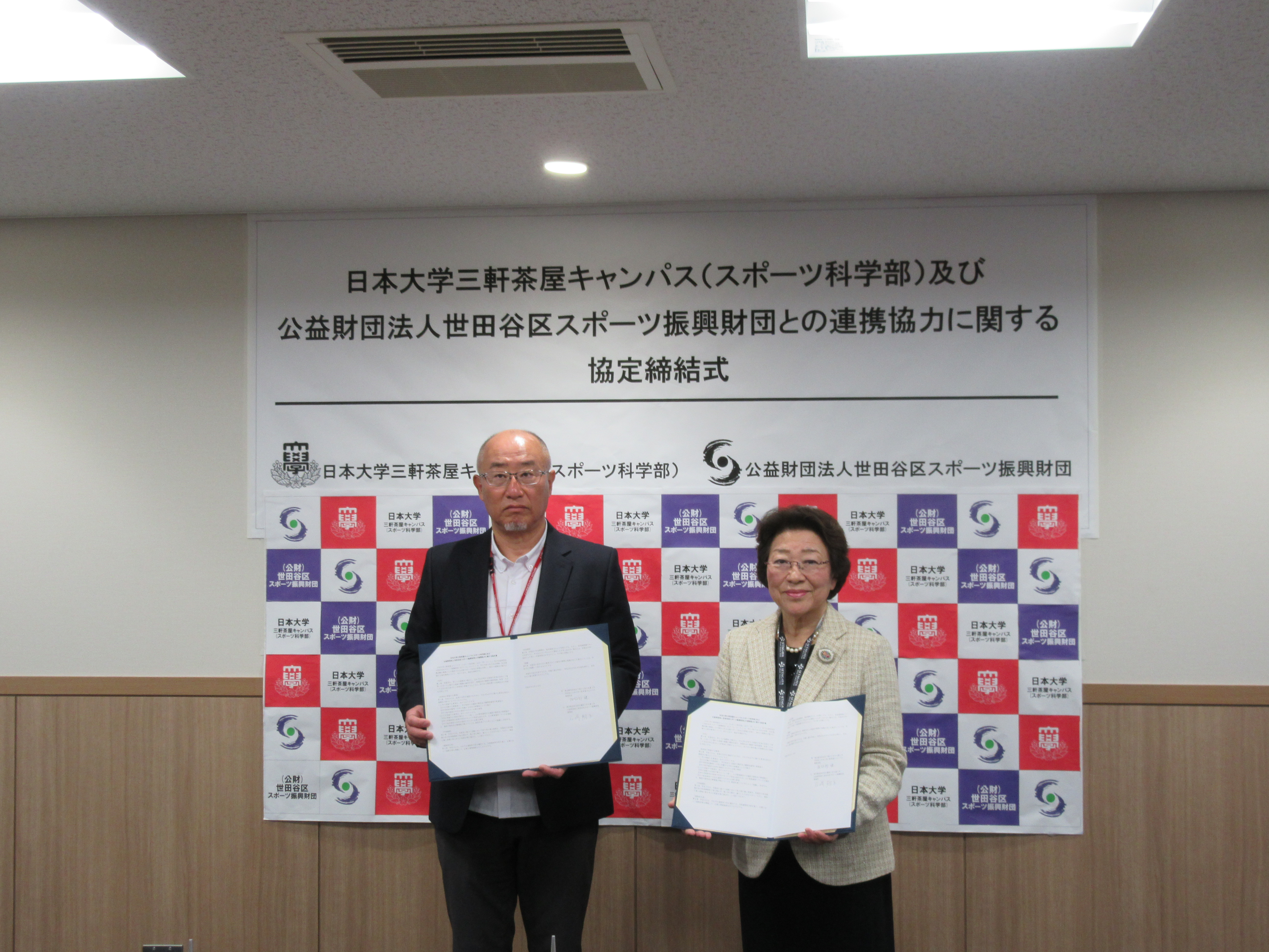 写真左:日本大学三軒茶屋キャンパス 諏訪部事務局長 写真右:公益財団法人世田谷区スポーツ振興財団 石﨑理事長